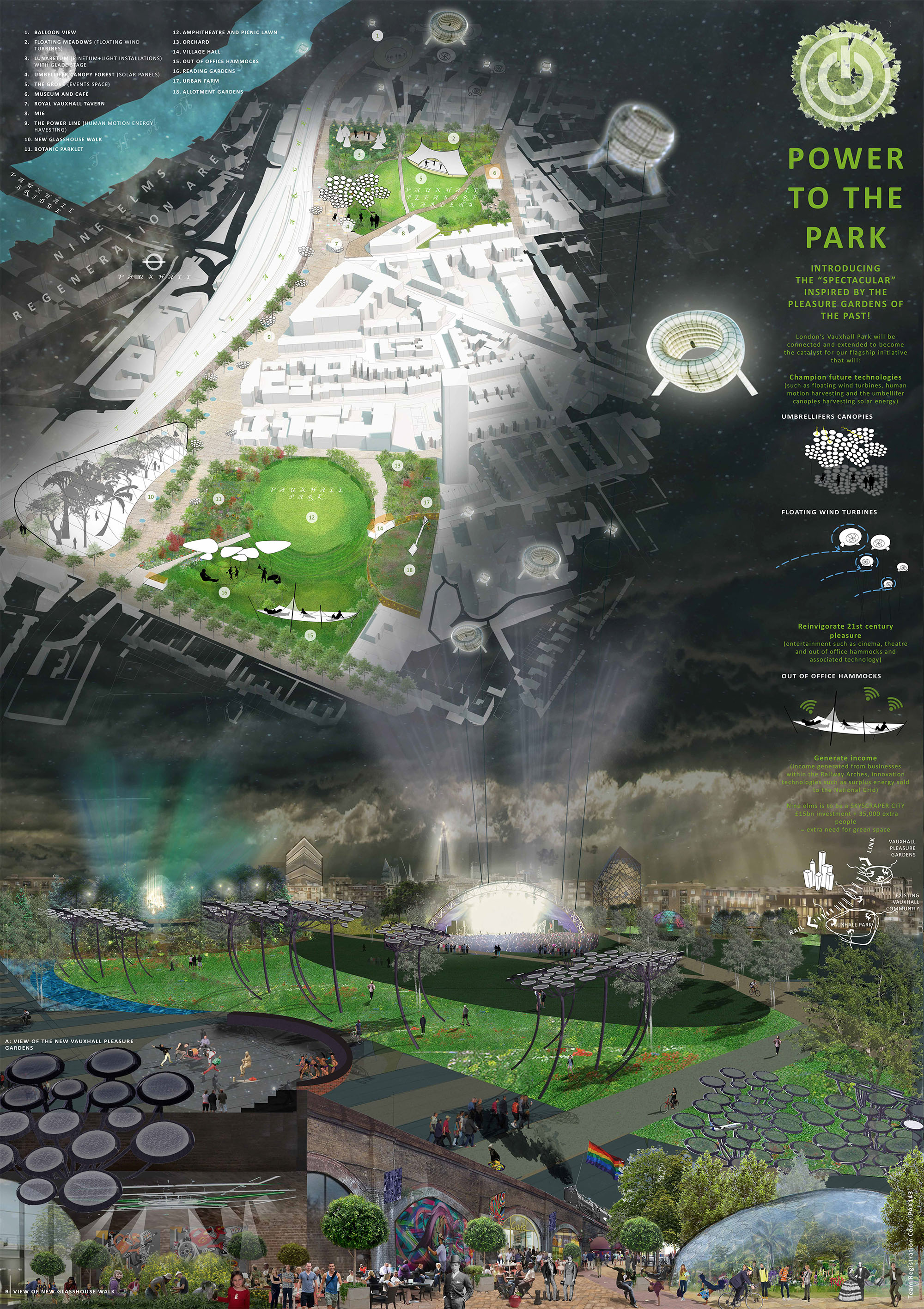 The design looked to redesign Vauxhall Park, London with the ethos of bringing power to the park through creation of sustainable energies and showcasing new technologies, thus reigniting interest and economy within the public parks of today.